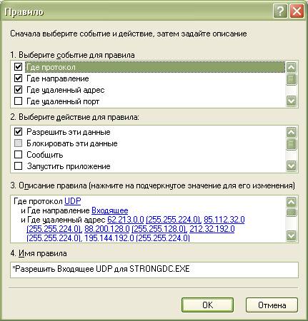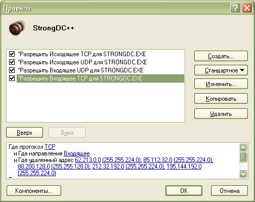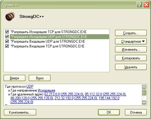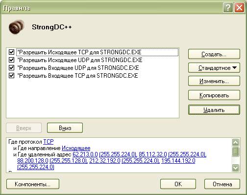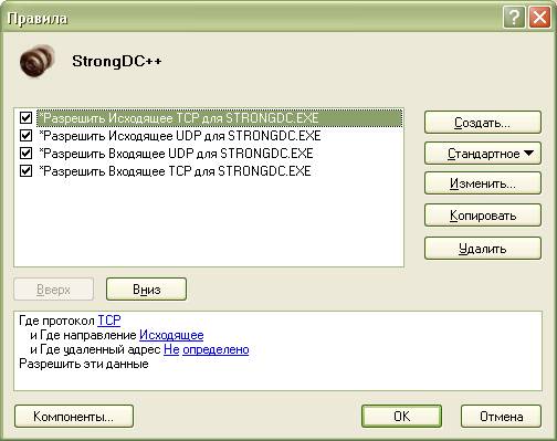 Параметры > Приложения > Добавить… > (указать путь к файлу StrongDC++.exe) > Создать… (у меня 4 правила может можно и меньше :) ) сделать как на картинке
